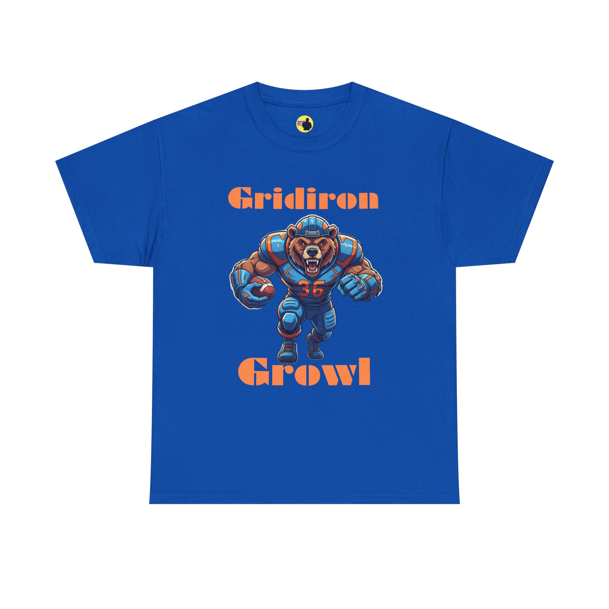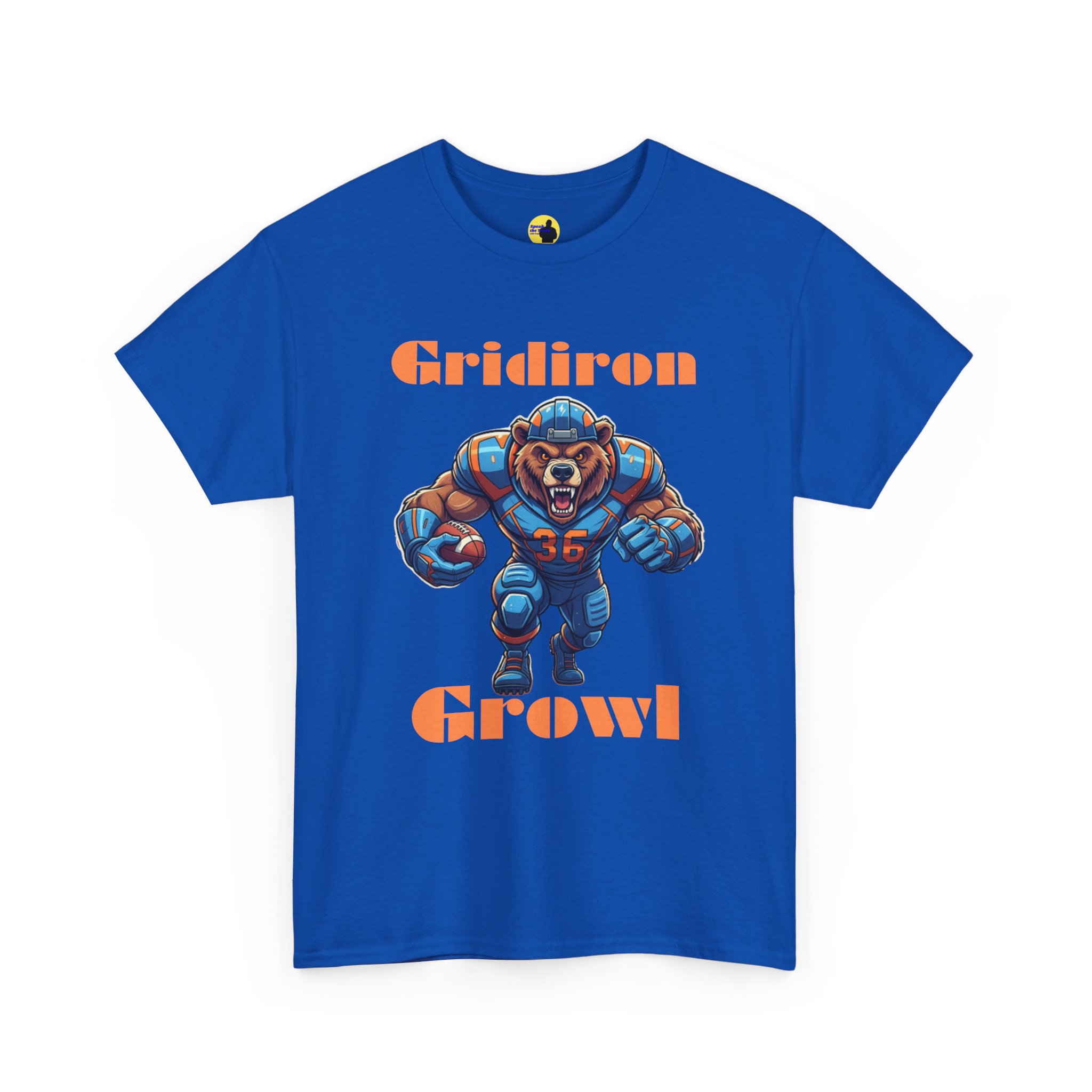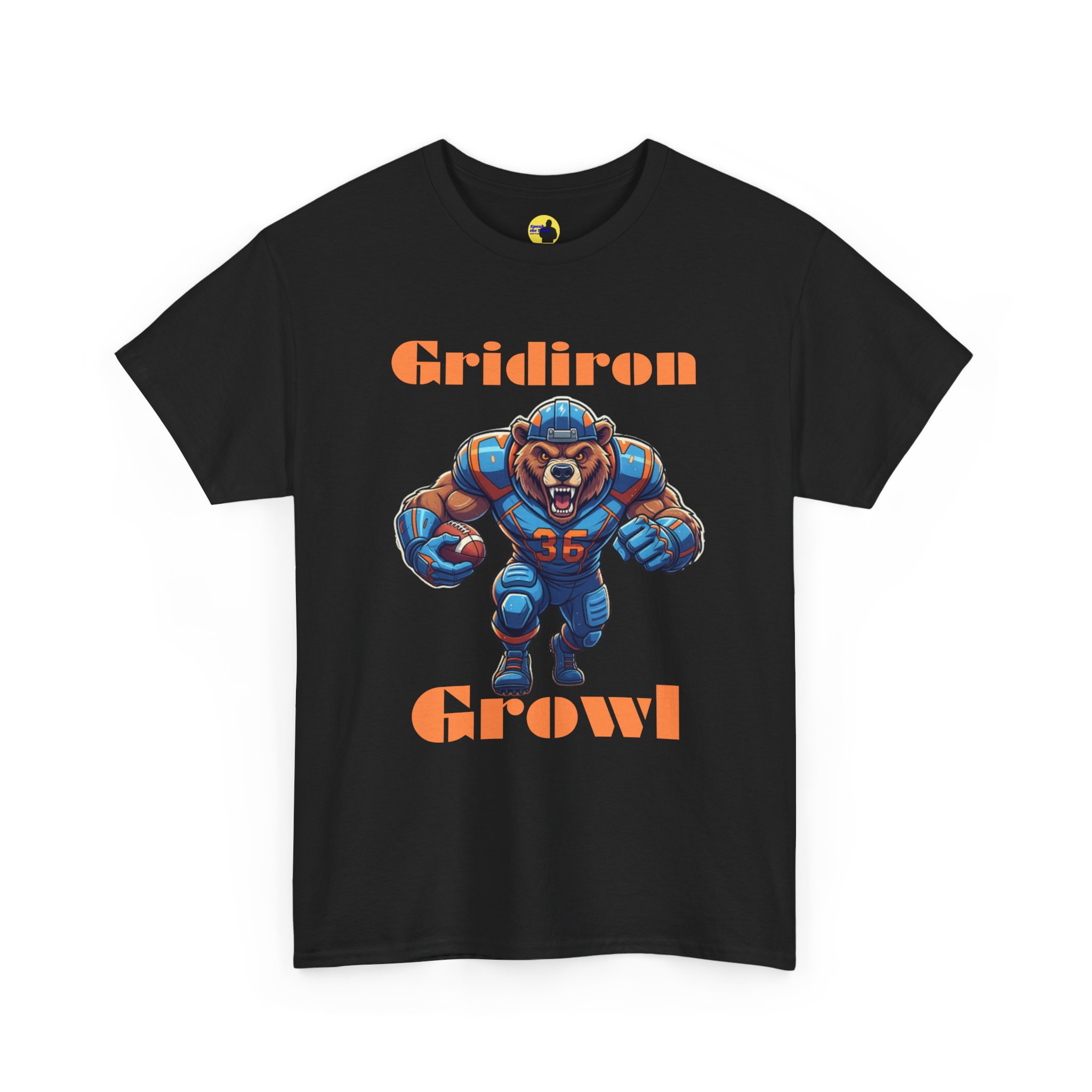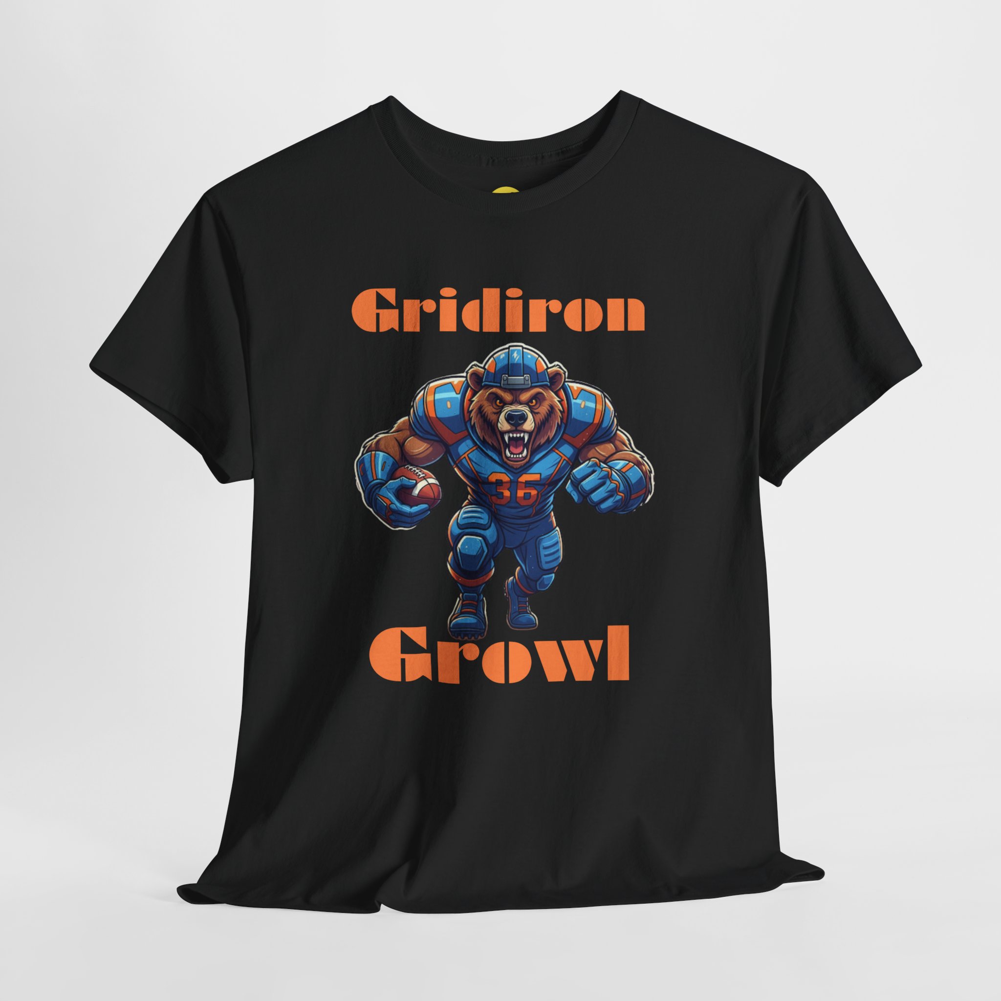 This classic cotton tee brings a bold, sporty energy to everyday wear. At the center, a fierce bear in full football gear charges forward beneath the bold, blocky type reading “Gridiron Growl” — vibrant blues and oranges that pop on the black shirt. The fit is relaxed and comfortable, built for movement whether you’re cheering in the stands, tossing a ball at the park, or layering for game-day hangouts. The soft, midweight fabric holds prints sharply and wears well across seasons. It’s the kind of shirt that reads like team spirit with attitude — casual, durable, and loud enough to start conversations.